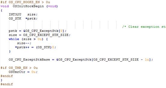 在OSInitHookBegin()中把定义的CPU异常堆栈清零,并把栈顶赋给OS_CPU_ExceptStkBase。