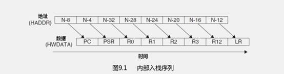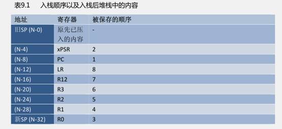 入栈的顺序在CM3内部是打乱过的,可以看到PC首先被压入堆栈,LR最后被压入堆栈,但是最终堆栈里数据的存储地址是按照xPSR,PC,LR,r12,r3,r4,r1,r0这个顺序来保存的。