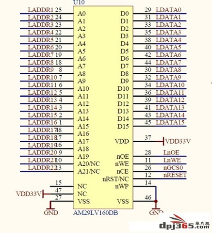 AM29LV160DB第47脚是BYTE#脚,BYTE#接高电平时,器件数据位是16位,接低电平时,数据位是8位。上图BYTE#接VCC,D0-D15做为数据输入输出口。
