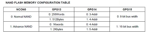 当选定一个NAND FLASH的型号后,要根据选定的NAND FLASH来确定S3C2440的NCON,GPG13,GPG14,GPG15的状态。