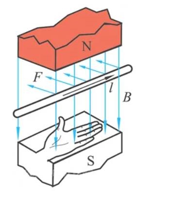 伸开左手,使大拇指和其余4指垂直,手心面向N极,4指顺着电流的方向,那么大拇指所指方向就是载流导体在磁场中的受力方向。力的大小为: